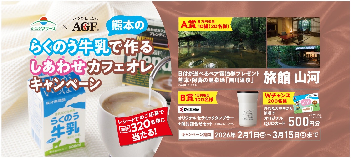らくのう牛乳又はAGF®の対象商品を購入し、特設サイトからレシートで応募すると、総勢320名様に黒川温泉ペア宿泊券やオリジナルセラミックタンブラーなど豪華賞品が当たります🎁